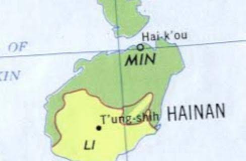 标“MIN”的区域,是闽语区,讲海南话,也就是闽语方言,标“LI”的是黎语区