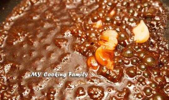 Step4.同一油锅,先将蒜头下锅爆香后加入步骤2的酱汁炒香。