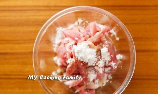 Step1.首先将猪肉丝与腌料均匀混合备用。