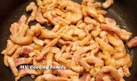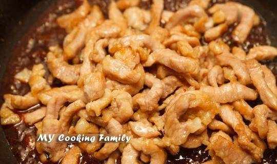 Step3.起油锅,将猪肉丝下锅炒至7分熟后起锅备用。