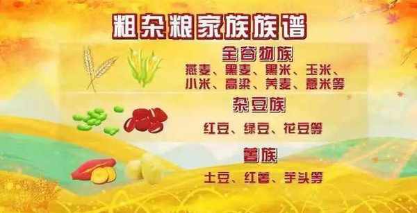 粗杂粮包括燕麦、薏米、黑米等全谷物类,以及绿豆、红豆等杂豆类,还有土豆、红薯、芋头等薯类。