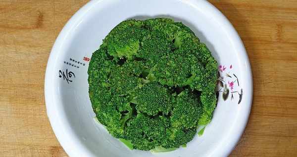 【第五步】:将西兰花捞出,将小朵放入准备好的大碗中,撒上小朵。