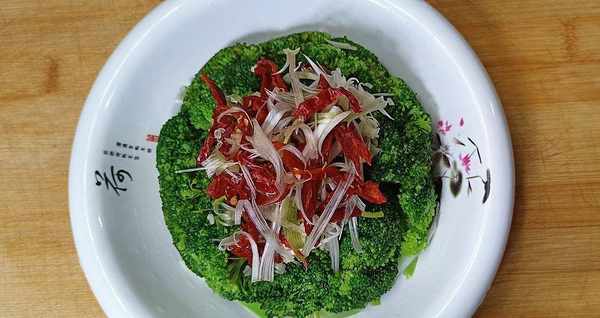 【第七步】:蒜茸、泡辣椒、葱切段,沥干水分,放入西兰花中,倒入冒烟的热油,激发出香料的香气。