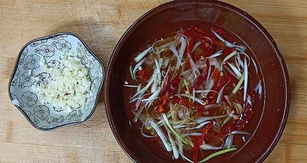 【第二步】:将大蒜切成蒜末装盘,干辣椒切片,葱切片,放入碗中,加水泡发。