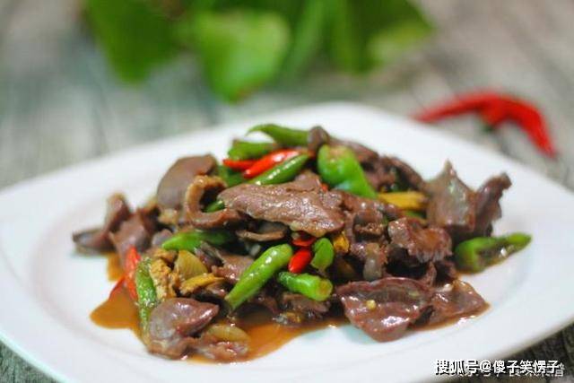 5、等青椒和小米椒炒至稍变色时,加入猪心。