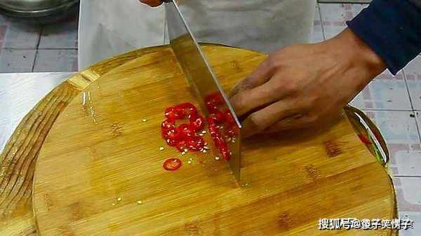 红尖椒一个,切成比较细的辣椒圈,装入调菜盆中。