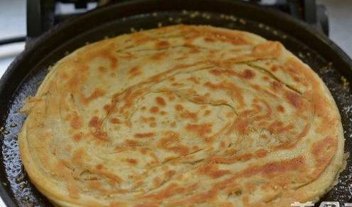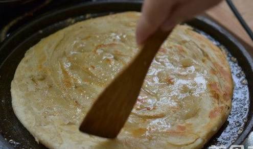 中间再翻一次面,用铲子给饼扎洞,这样油会渗入到饼中,增加酥脆口感