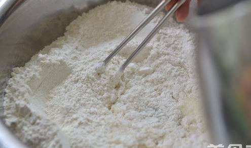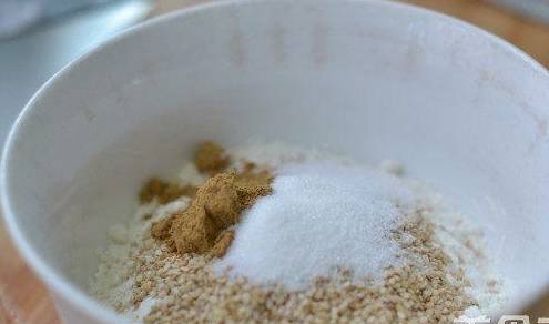 碗中加入面粉80克、芝麻20克、五香粉5克、食盐10克