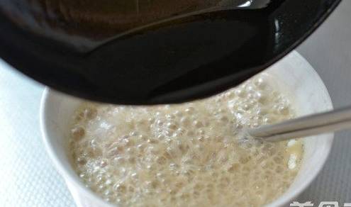 锅中加热大概100克植物油,可以加入适量花椒提味,加热到冒烟后晾一会后分次慢慢倒入碗汁;关键提示:一定要把热油晾一会,不然过高的油温会使面粉糊掉