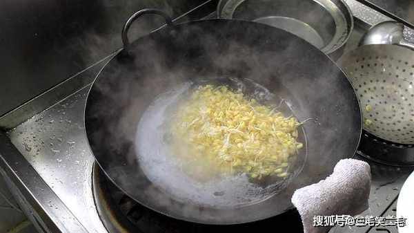 4.锅中加入适量的清水,快要烧开的时候倒入黄豆芽,水烧开后,焯水一分钟左右即可捞出,豆芽焯水是为了快炒过程中生熟一致。