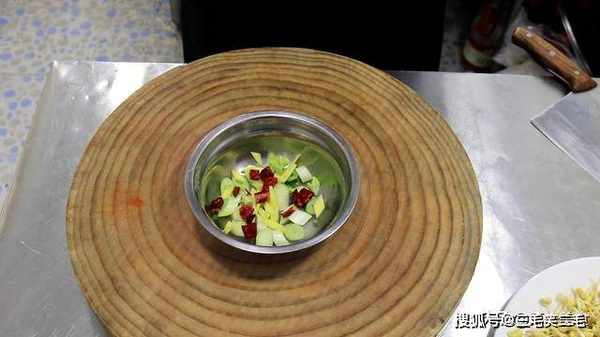 2.大葱白一段斜刀切成马蹄片,生姜一块切成菱形片,干红辣椒几粒放在一起备用。