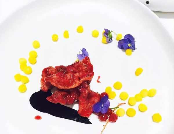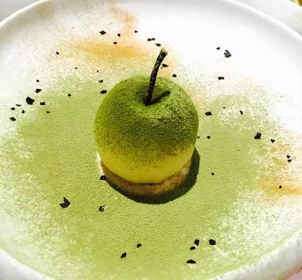 4.将牛颊肉和梨子摆盘,撒上小麦草粉装饰即可上桌。