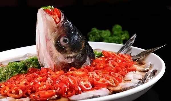 2、笋片摆盘,鱼片、鱼头摆盘。上笼蒸15分钟。取出撒上青红椒圈,淋上自制酱料(金巴麻辣鲜露、金巴鲜酱、金巴鱼豉油、小米辣酱、藤椒油)