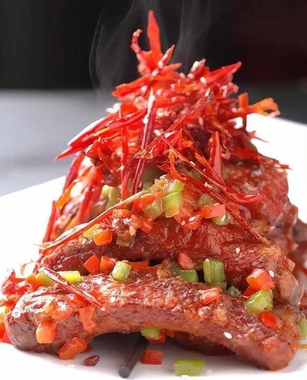 2.加入调味鲜露和鲜汁炒香,淋在排骨上,撒上干辣椒丝点缀。