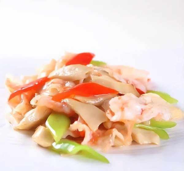 3、加入青红椒片,最后加入煮熟的虾片,翻炒片刻,加入盐、鸡粉和少许高汤稍作搅拌,装盘。