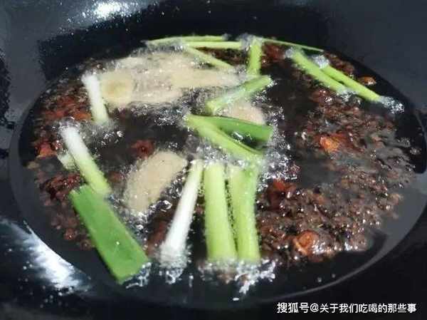 6、切葱段、姜片,洋葱切丝,香菜切段,再准备一些花椒、八角。锅里倒入适量油,放入这些调料,小火炸至颜色焦黄,滤掉这些调料,留下热油。