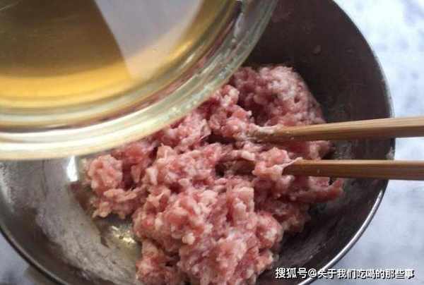 5、把放凉的葱姜花椒水分多次倒入肉馅中,用筷子搅拌,让肉馅吸收水分,这样就会变得鲜嫩多汁。对于一般人来说,一斤肉馅加4两水即可,加多了肉馅比较稀,不好包了。