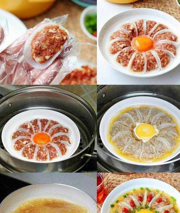 4.将肉馅团成乒乓球大小的丸子,用白萝卜片夹起来,码在盘子里,中间放上鸡蛋黄,上锅蒸20分钟