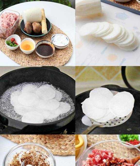 1.将白萝卜切薄片,水里加点盐煮软捞出浸泡冷水备用