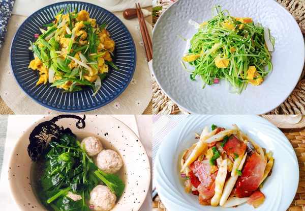 菠菜、蒜苗、豌豆苗和春笋,都是适合春天吃的碱菜,清淡鲜香有营养,比大鱼大肉强不少,阳气生发的季节很容易上火,日常饮食尽量做到荤素合理搭配,少油少盐,美味又健康!