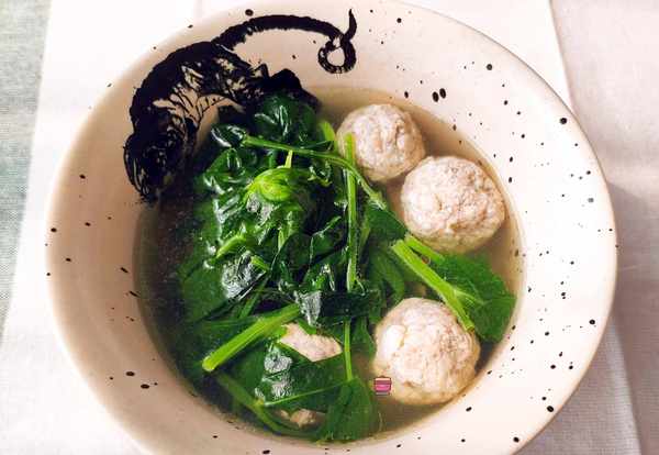 3、 丸子煮熟后,把清洗干净的菠菜放入锅中,再加入少许盐和白胡椒调味。