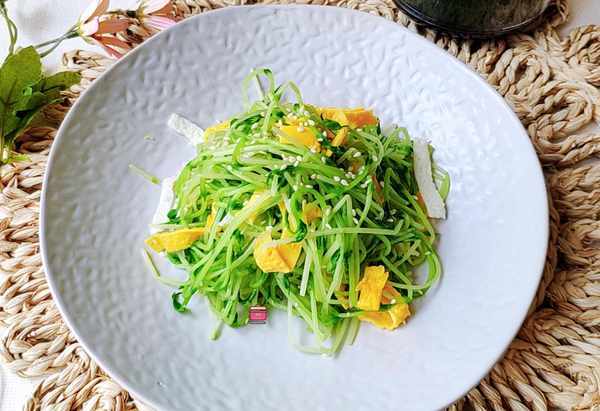 4、 将豆苗和鸡蛋一起倒入大盘中,加入少许米醋、盐、糖、香油和熟的白芝麻一起拌匀即可。
