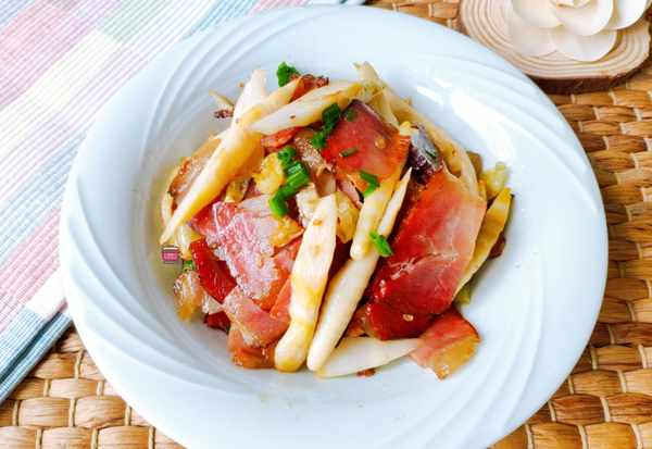 3、 处理好的笋尖切段,腊肉切薄片,泡椒切碎,大蒜切末,香葱切成葱花备用。