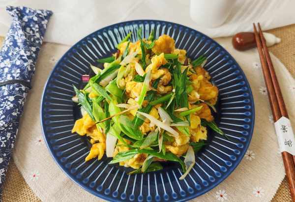 3、 用锅中底油煸香蒜白,闻到蒜香味后把鸡蛋和蒜叶一起倒入锅中,翻炒1分钟。