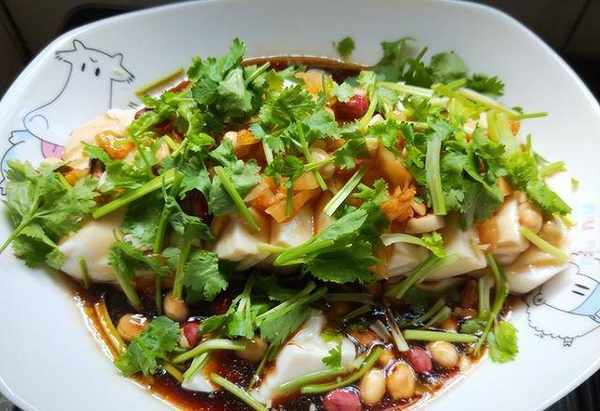 2)将葱花撒在豆腐上。