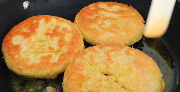 19.起锅倒油,油热下入饼坯,盖上盖子开小火慢烙。