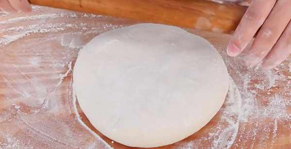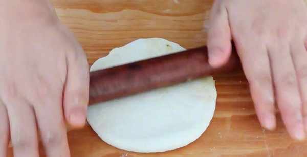 16.稍稍按扁之后用擀面杖擀成圆形面片。