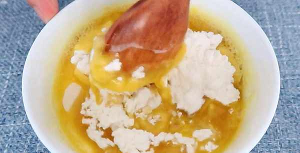 4.100克面粉放入碗中,淋入滚烫的热油,搅拌均匀备用,油酥就做好了。
