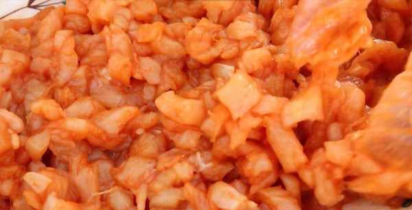 5.准备两块新鲜的鸡胸肉,先对半切开,再切成条,最后切成丁。买的速冻的需要腌制去腥,加葱姜水腌制5分钟以上才行。