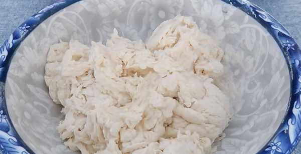 2.500克面粉放入盆中,用前面调好的酵母水和面,一边倒一边搅拌,搅拌成面絮状。