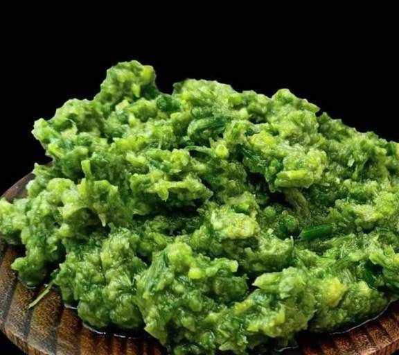 第四,将晾干的韭菜花用无水的案板和菜刀剁成韭菜碎,装入一个无水的大盆内,红辣椒则先去蒂再同样步骤切碎装入大盆,最后将之前剁好的生姜末、花椒粉、梨肉末全部倒入韭菜碎内一同搅拌均匀,然后再加入食盐30克继续搅拌2分钟至所有食材完全混合均匀。