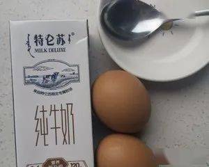 纯牛奶一盒,鸡蛋两个,家用大小的勺子两勺白糖,喜欢甜的可以多放一点