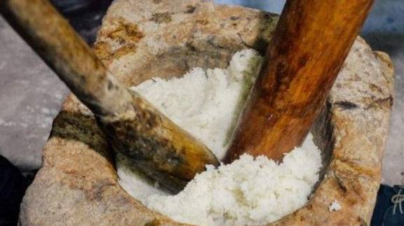 你们看在石臼里放着的就是糯米了,壮年们一般都是用舂来捶打成糍粑,很多人看在眼里应该会觉得好玩吧,不过小妖要告诉你们这可是非常累人的一件事情呢,不过要打的好才能够吃到好吃的糍粑。