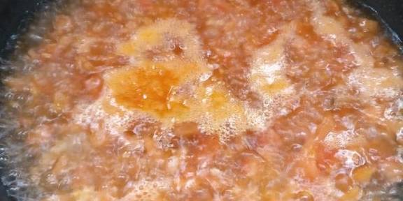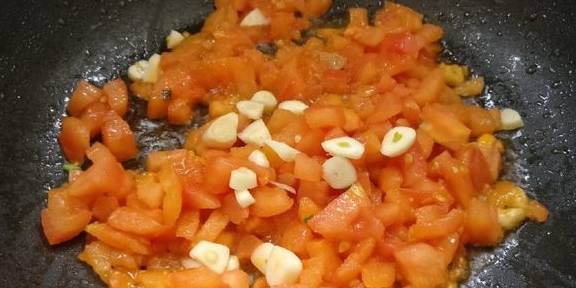 4、在锅里倒入适量的花生油,小火烧热后,把蒜米放进去爆香,接着倒入西红柿碎煸炒出西红柿红油