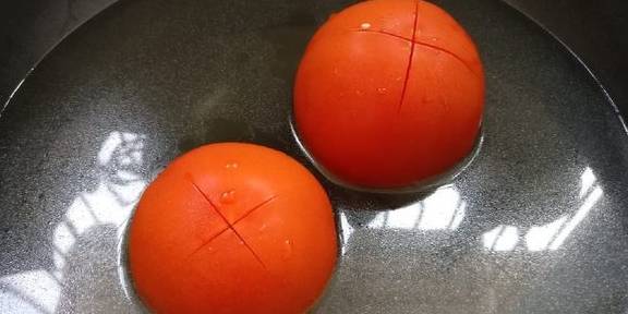 2、在锅里烧热半锅水,把西红柿放进去,继续小火烧沸,把西红柿烧到爆裂脱皮,拿出来从十字刀口出手撕就可以很容易撕开一大片皮了