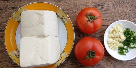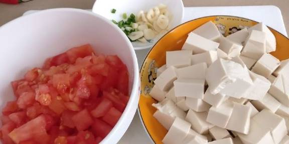 准备好食材:水豆腐(嫩的)2块、西红柿2个、蒜米3粒切片、葱花一根切碎