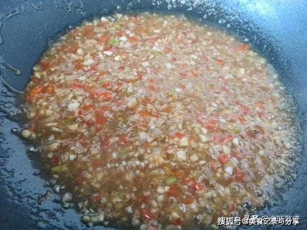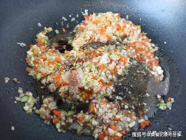 5、锅内烧油,油热以后下入葱姜蒜、香菇和青红椒末,开大火炒出香味后,把香菇渗出的汁水,倒入锅中,大火煮上3分钟,这汁水很有营养。
