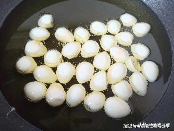 3、锅内烧油,等待油温5成热,下入鹌鹑蛋,大火炸至金黄色捞出。
