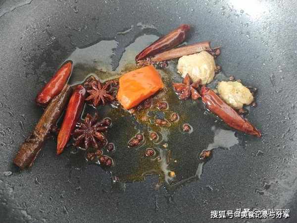 5、锅中加入适量油,依次放入准备的大料,炒出香味,最后放入火锅底料,小火炒散。