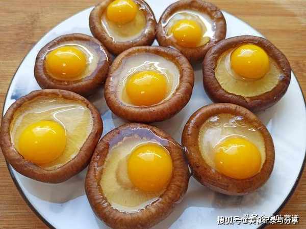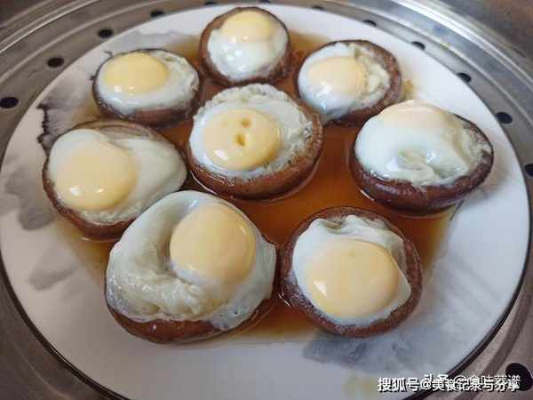 2、香菇处理好之后,底部朝上,均匀的码放在蒸盘中,接下来把鹌鹑蛋磕入香菇的小窝窝里,把蒸盘放入箅子上,把水烧开,大火蒸15分钟,蒸熟为止。