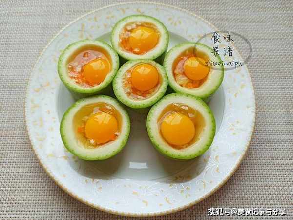 3、准备六个鹌鹑蛋,小心翼翼地磕破,装进西葫芦中,开水上锅,转中火蒸8分钟。