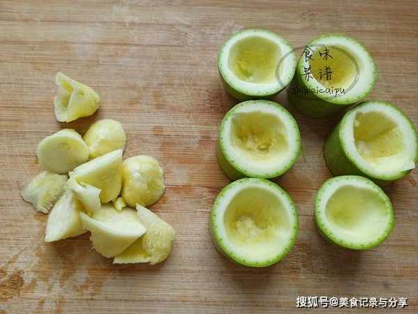 1、准备一个鲜嫩的西葫芦,清洗干净,切成大小均等的段,挖掉中间的籽粒,注意别挖穿了。