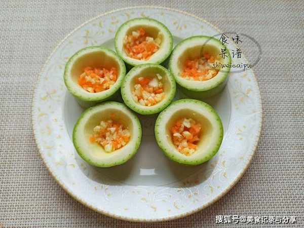 2、挖出来的部分也别浪费,加点胡萝卜,一起切成碎末,装进西葫芦中。