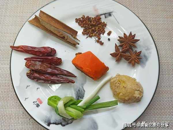 2、准备一些卤料,依次有火锅底料、香葱、桂皮、八角、花椒、干辣椒、小茴香、生姜。