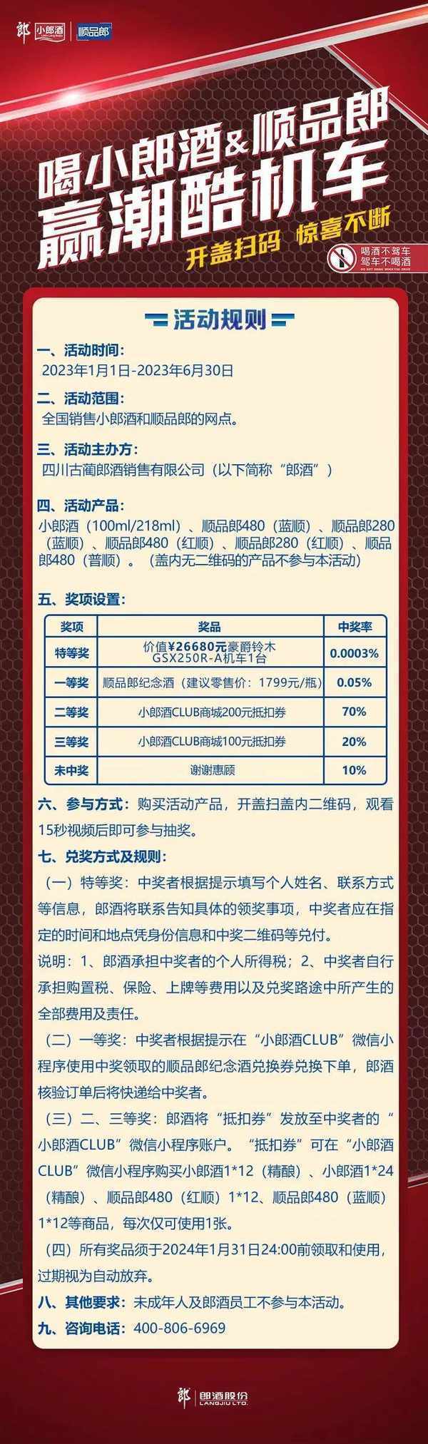 小郎酒&顺品郎放大招啦!惊喜送不停!现在喝小郎酒、顺品郎,开盖扫码有机会赢取万元机车、还可以抽红包噢!