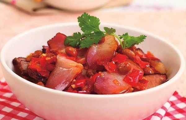 2 将腊八豆放入碗中,在上面铺上腊肉,加入剁椒,上锅蒸20分钟,撒上葱花。